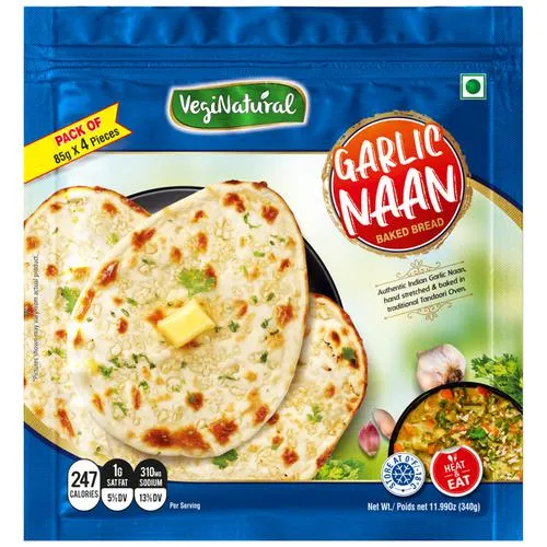VEGINATURAL Garlic Naan – Flavourful, Pre-Cooked, Heat & Use, Perfect Accompaniment For Rich Gravy Dishes, 340 g (Pack of 4)